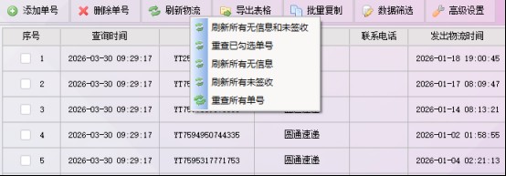 • 灵软快递批量查询高手:查询前最少勾选一个接口,优先选择独立接口(多线程),成功率更高;查询中通等特殊快递时,需在高级设置中输入发件人/收件人电话后4位鉴权;无信息可点击“刷新物流”,选择“无信息”状态批量重新查询,还能设置跟踪提醒,物流更新后及时知晓;